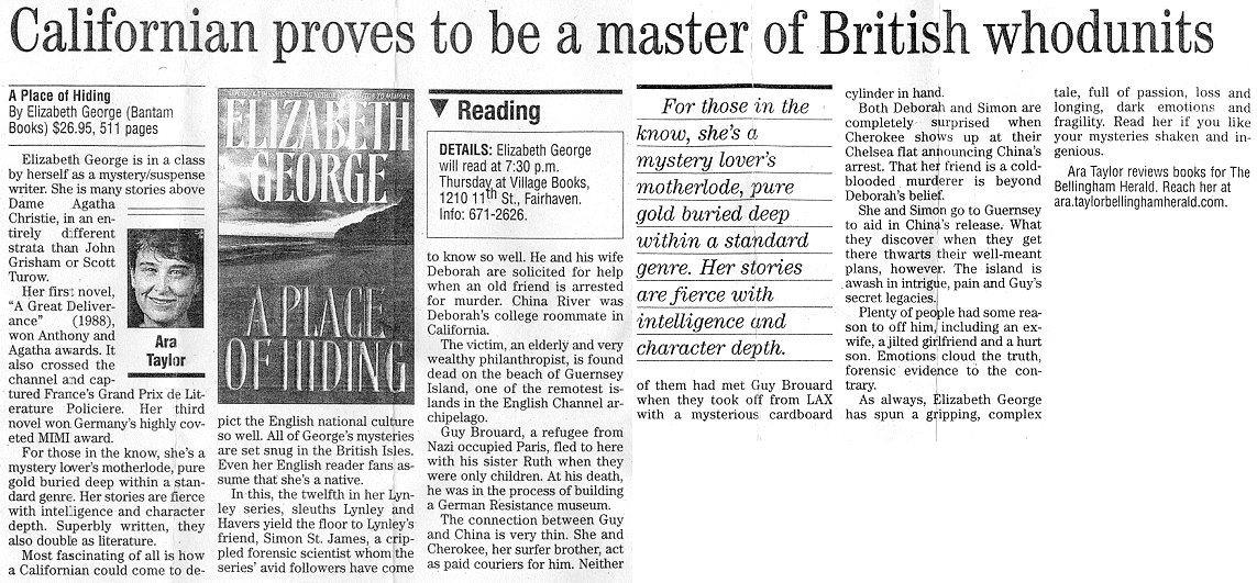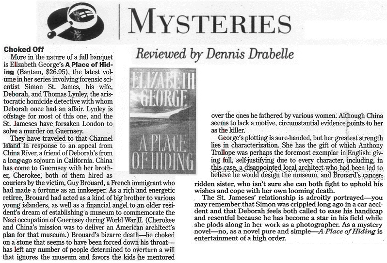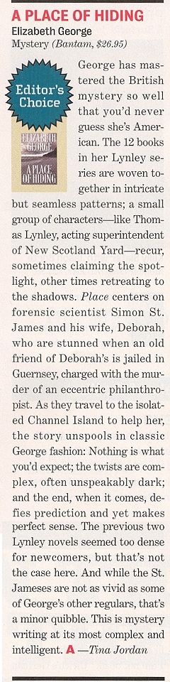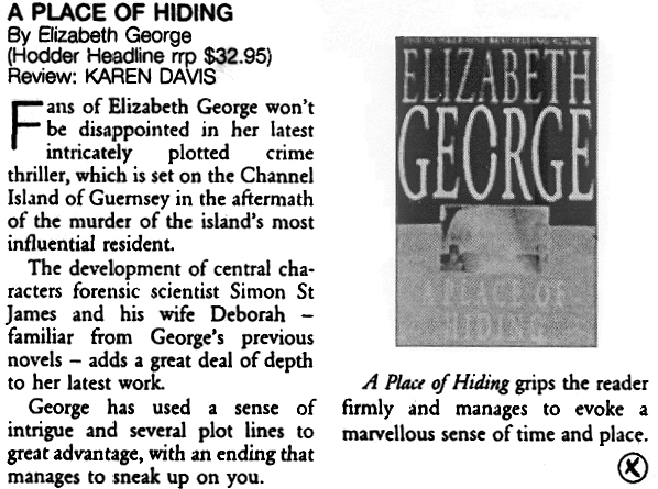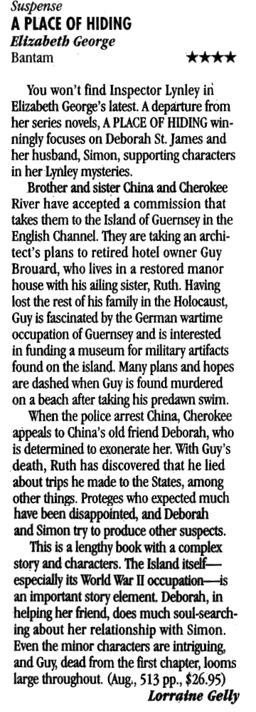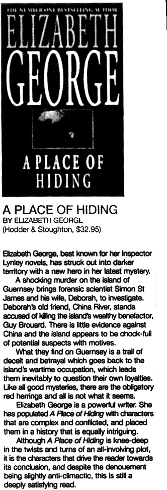 reach toward any number of suspects, from California surfers to Holocaust survivors. (A Place of Hiding) is developed, multi-stranded and well paced, and has a very good solution that is wholly satisfying. She tells her story with beautiful and rich prose, and in my mind is the finest American exponent of this type of "traditional" British mystery. (True, she doesn't always get it 100% right, but she's so good that it hardly matters.) Existing fans are apt to think this her strongest work in a while, and those who have not yet read George will find this an excellent place to begin. "George's plotting is sure-handed, but her