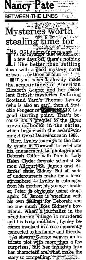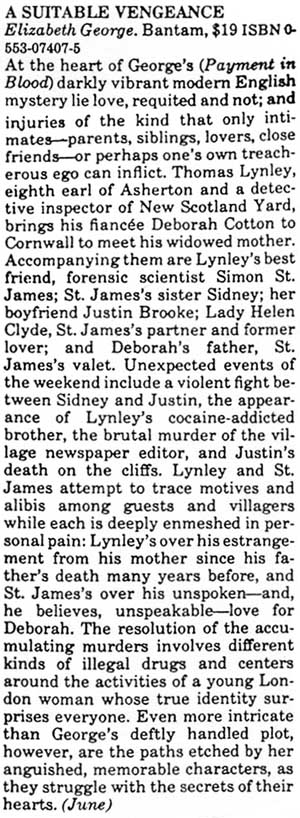 "Even more intricate than George's deftly handled plot…are the paths etched by her anguished, memorable characters, as they struggle with the secrets of their hearts." "A Suitable Vengeance is not only believable and unpredictable but offers beautifully written prose." "George belongs in a very small field at the top of English murder mystery writing." "As always, George weaves an intricate plot with more than a few surprises, but her insights into her characters are what make the story so compelling." "Readers will come away well satisfied." "The real pleasure and richness in this book come from the lush, detailed writing about unusual lives and relationships charged with complexity." "A Suitable Vengeance is one of those books that readers will race through to find out what's happening then will return to again, and maybe again, just for the sheer pleasure of it."