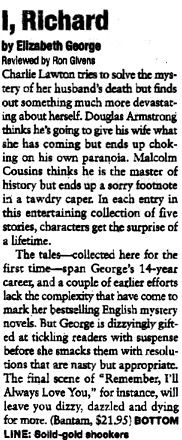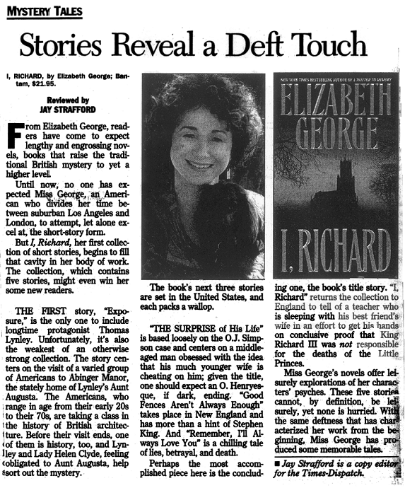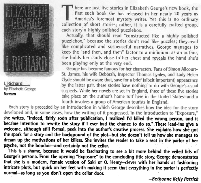 George's stories are a skilled exploration of the dark minds of ordinary people contemplating the worst of crimes. "Exposed" concerns a university course on the history of British architecture, during which an adult student suspiciously dies while roaming Abinger Manor. George's beloved detective Thomas Lynley happens to be on hand and immediately sets to work solving the case. The title piece "I, Richard," is a gratifying tale centering on an impoverished historian who's spent years pursuing a letter written by Richard III on the eve of the Battle of Bosworth. His passion grows into an obsession and soon drives him to the very edge of insanity. In "The Surprise of His Life" -- an innovative take on the archetypal tale of a husband planning the murder of his wife -- George uses all of her inventiveness and subtlety to spin pure gold from a standard plot of the mystery genre. In I, Richard, Elizabeth George digs deep into the ugliest tendencies of human nature and lays them bare with a beautiful and lyrical narrative voice. Here you'll find chills, irony, and powerful satire that will hook you from the opening page -- a royal feast of thrills and suspense written by the queen of British mystery. Tom Piccirilli" "In her first story collection, eminent British author George (A Traitor to Memory) presents five nimbly written and gripping tales, each with a stunning conclusion. "Exposure" concerns declining sexual prowess, as gossipy architecture students speculate about Polly Simpson, who is suspiciously friendly with elderly men touring Abinger Manor, where one oldster dies mysteriously just as some historic silverware is stolen. In "The Surprise of His Life," high-powered CEO Douglas Armstrong, obsessively jealous and mistrustful of his young wife, learns too late that she's planning an astonishing final surprise for both him and the reader. Similarly, a young widow in "Remember I'll Always Love You" is horrified to discover the secret double life led by her late husband, purportedly a sales director for a biotech firm, but in reality something far more sinister. A melancholy tone pervades "Good Fences Aren't Always Enough," in which an elderly Russian refugee, Anfisa, scandalizes her socially conscious neighbors in fashionable East Wingate with her determination to live life her own way. In the title story, ambitious and murderous schoolteacher Malcolm Cousins is determined to perpetuate the reputation of his hero, Richard III, while also absconding with the wife and substantial legacy of a former school chum. A brooding, gloomy dust jacket suggests gothic themes, but the tales are thoroughly modern in setting and subject. (Oct. 29) Forecast: Advertising in national newspapers and magazines as well as holiday catalogs, plus NPR sponsorship announcements, should help sales approach those of the author's novels." "George, author of the deservedly popular Thomas Lynley/Barbara Havers mysteries, tries her hand at the short story form with this collection of five tales. Each story is introduced by George, who describes how she came to write it. "Exposure" is a condensed version of a Thomas Lynley mystery, while both "The Surprise of His Life" and the title story mix horror with humor to portray the desperate acts of men at mid-life, ending with a wittily vindictive twist that will appeal to fans of Ruth Rendell. "Good Fences Aren't Always Enough" probes a clash between a fiercely family-oriented young mother and her new neighbor, an aging, eccentric Russian immigrant. In "Remember I'll Always Love You," Charlie Lawton, a grieving young widow, sets out to find her deceased husband's estranged family and discovers a deadly secret. George, whose last novel, A Traitor to Memory, ran to nearly 800 pages, excels at writing in a more condensed way. Satisfying and memorable, this collection is highly recommended for most public libraries." "From the opening "Exposure" to