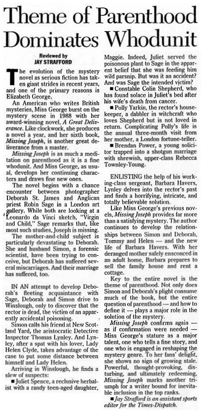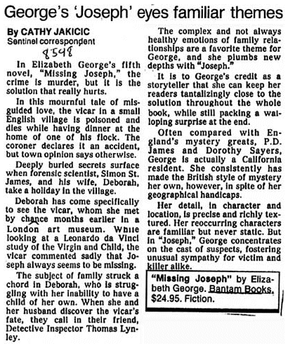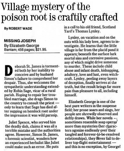 "Elizabeth George is one of the best pure writers in the suspense field; her prose soars and sings, her people are shrewdly observed and deftly drawn…Top-flight entertainment." "[A] layered, intricate mystery…deftly plotted, highly atmospheric" "It almost seems blasphemous to say it, but I think Elizabeth George outdoes Sayers…[She] puts together a totally satisfying mystery experience." "Ever since George, an American, began poaching in the British territory of P.D. James and Ruth Rendall five years ago, she has proved herself adept at thoughtfully and compassionately exploring the shades of gray of human behavior." "One of the year's 10 best crime novels!" "Elizabeth George's book fell as crafted and cared for as the lovely green twisting hedged mazes sometimes found on large British estates." |